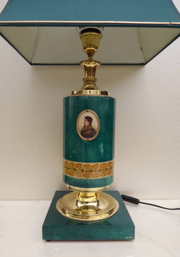 VERY RARE MID CENTURY VINTAGE TABLE LAMP MADE OUT OF GILDED BRASS AND BRONZE, GREEN LACQUERED GOATSKIN. MADE DURING THE 60s INITALYSIGNED WITH LABEL ALDO TURA MILANONEVER SAW THIS LAMP BEFOREVERY COLLECTABLE LAMPHEIGHT 68 CMWITHOUT SHADE 48 CMWIDTH SHADE 35 CMBASE 20 X 20 CMVERY GOOD VINTAGE CONDITIONVERY LUXURY DESIGN THAT REALLY MATCH A HOLLYWOOD REGENCY INTERIOR