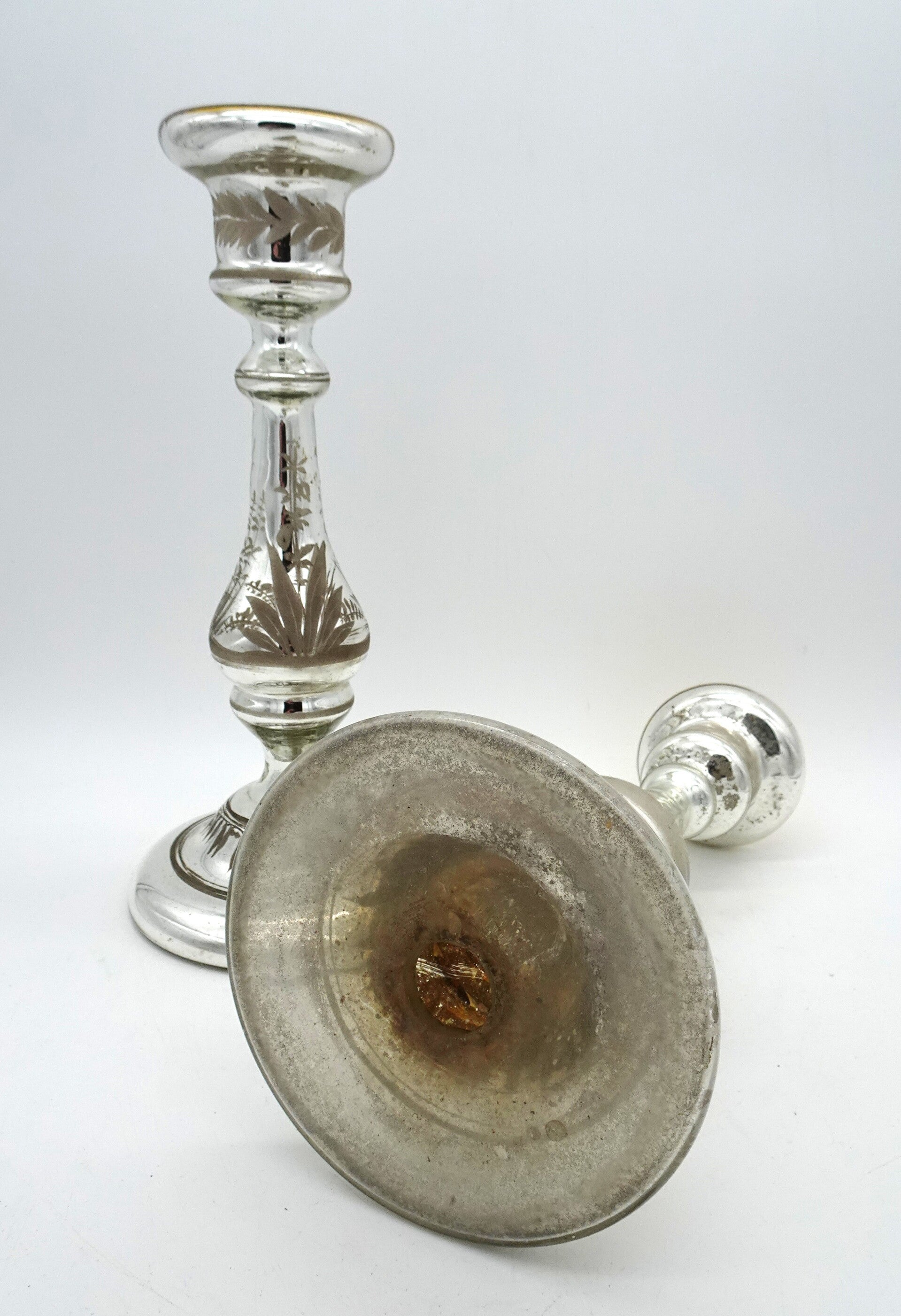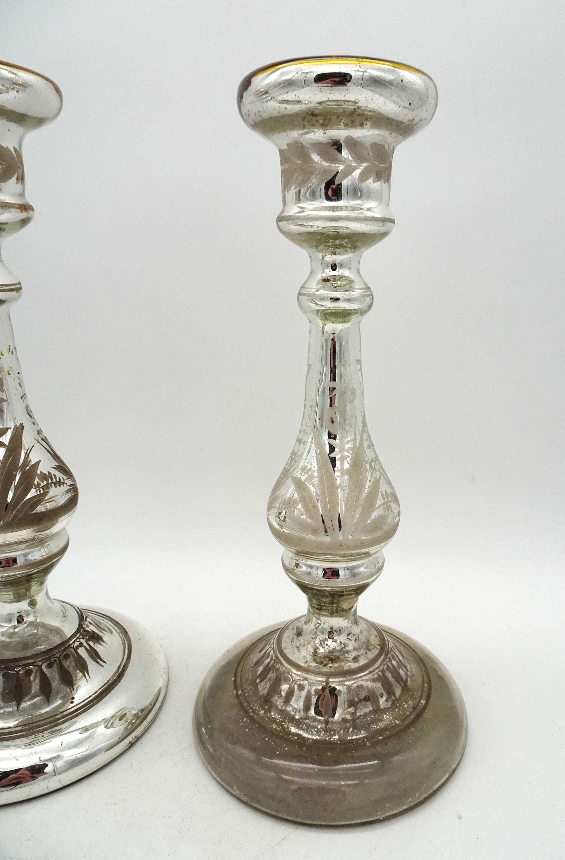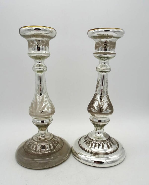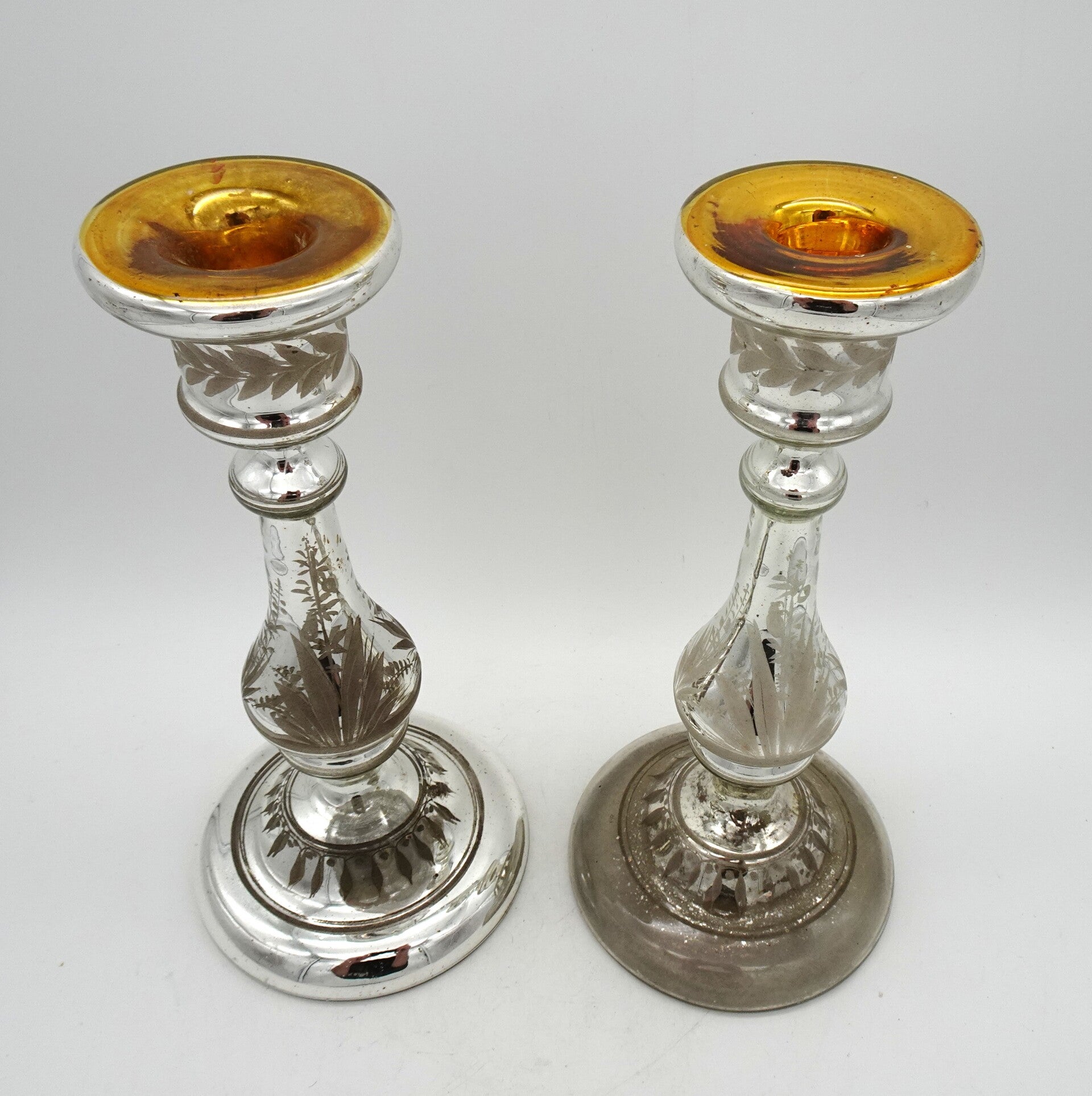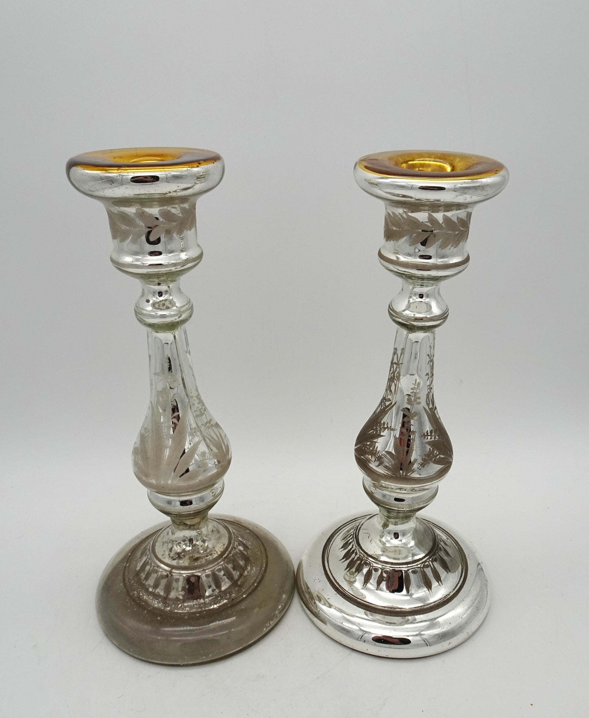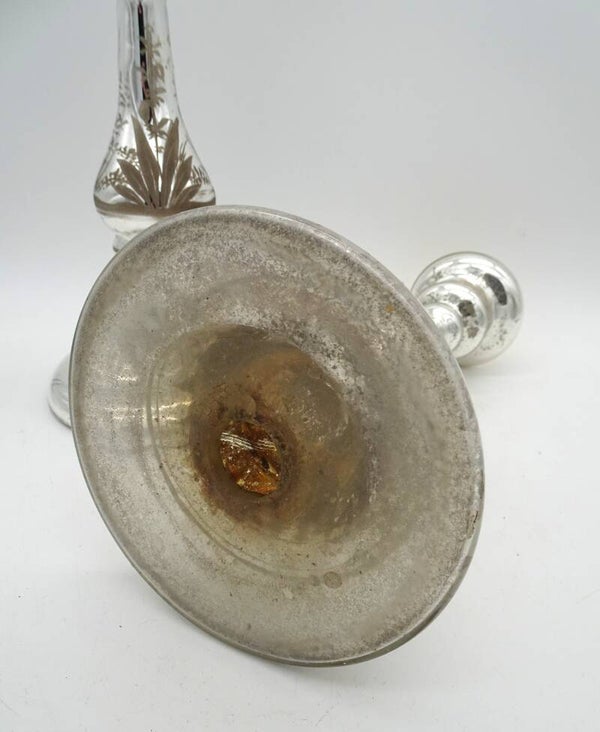Een paar mooie antiek aremluiszilveren kandelaars is glas met goud bovenaan. een heeft wat verlies van zilver binnenin.