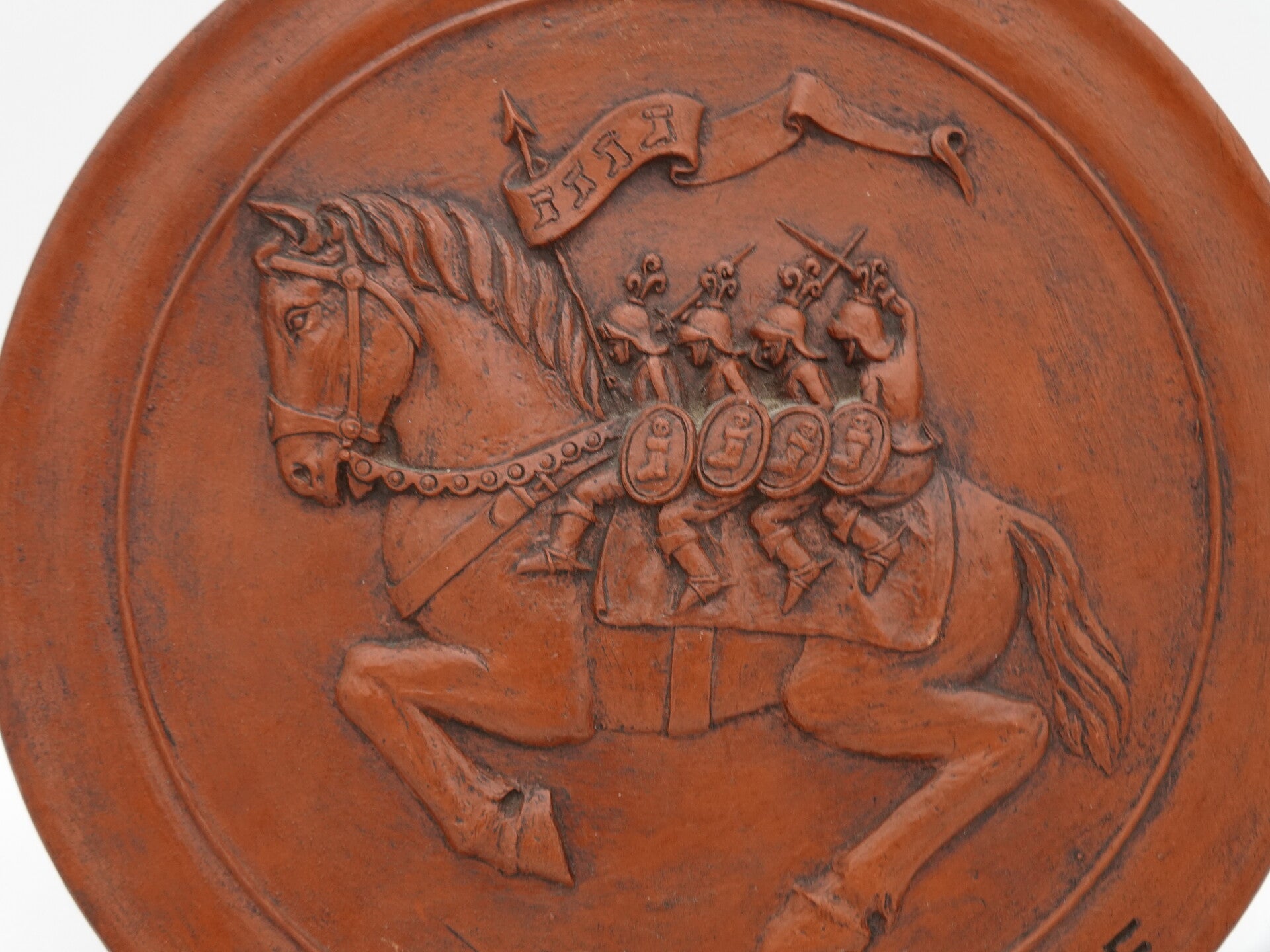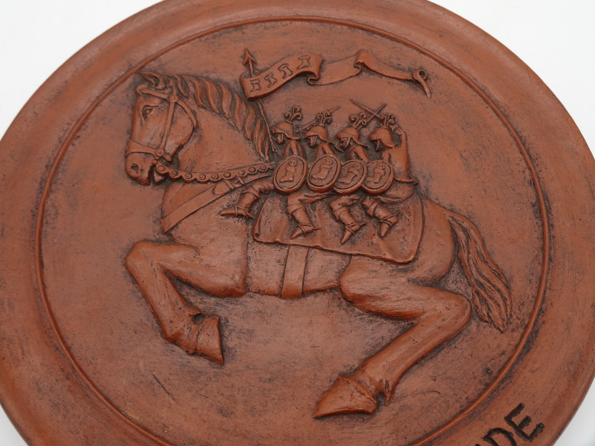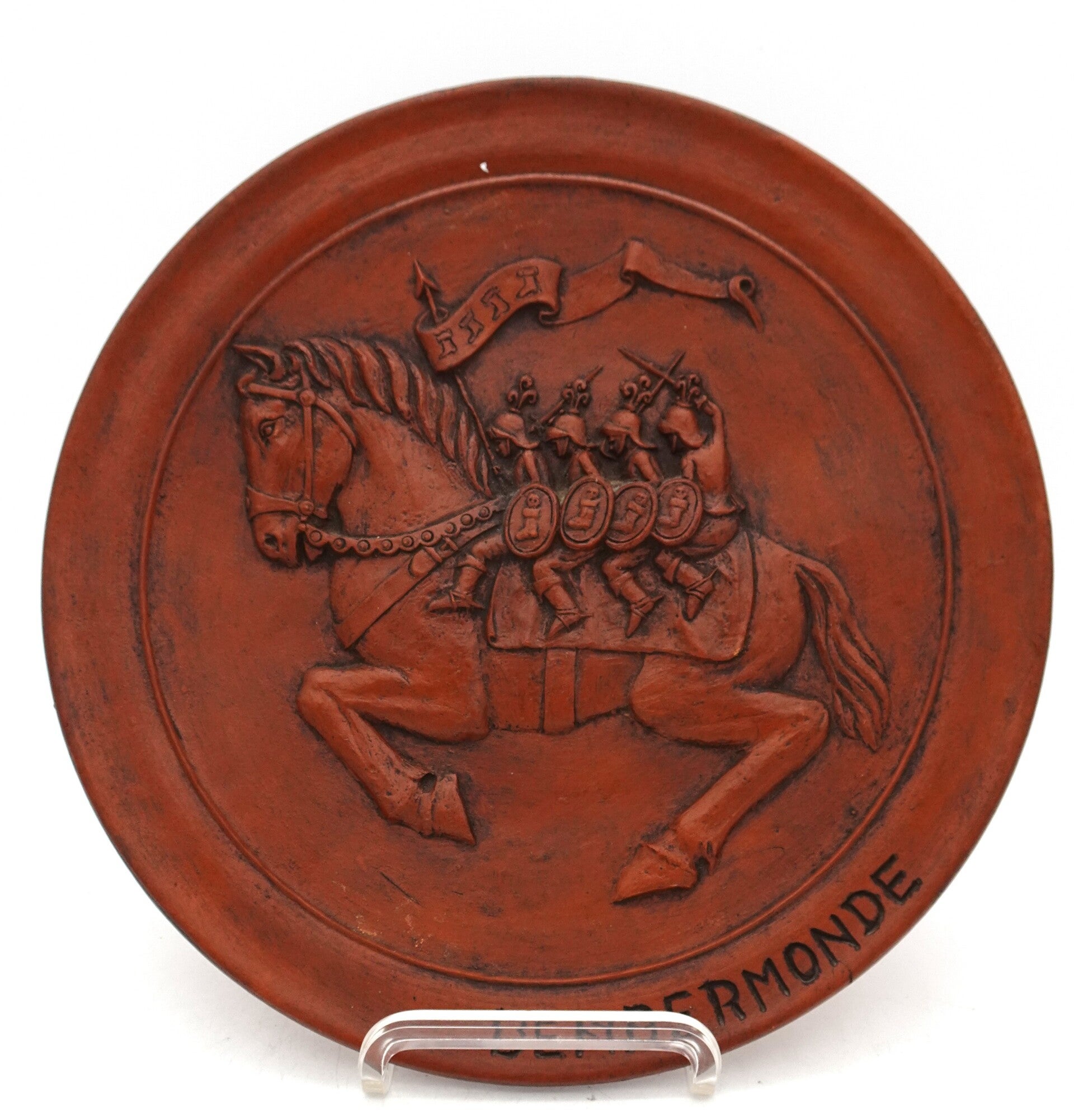 ROS BEIAAD VIER HEEMSKINDEREN PAARD DENDERMONDE TERRACOTTA WANDBORD