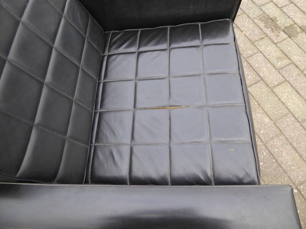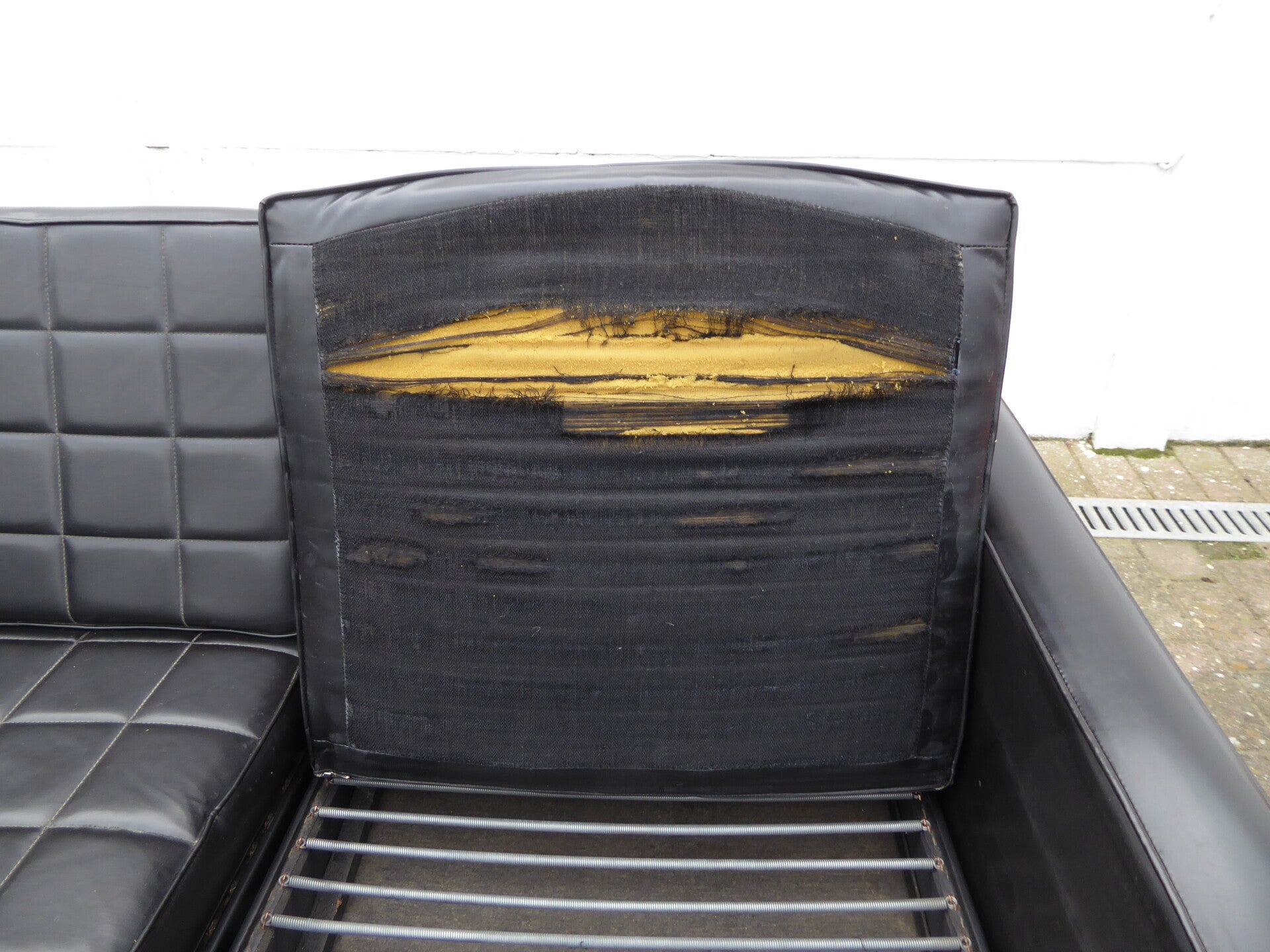 DE DRIEZIT IS IN GOEDE STAAT MAAR DE ACHTERKANT VAN DE KUSSENS MOETEN WORDEN HERSTELD. ZIJN VERSLETEN DOOR DE VEREN DIE WORDEN GEBRUIK IN DE ZETELS. DE TWEE ZITKUSSENS VAN DE ARMZETELS MOETEN WORDEN GERESTAUREERD.