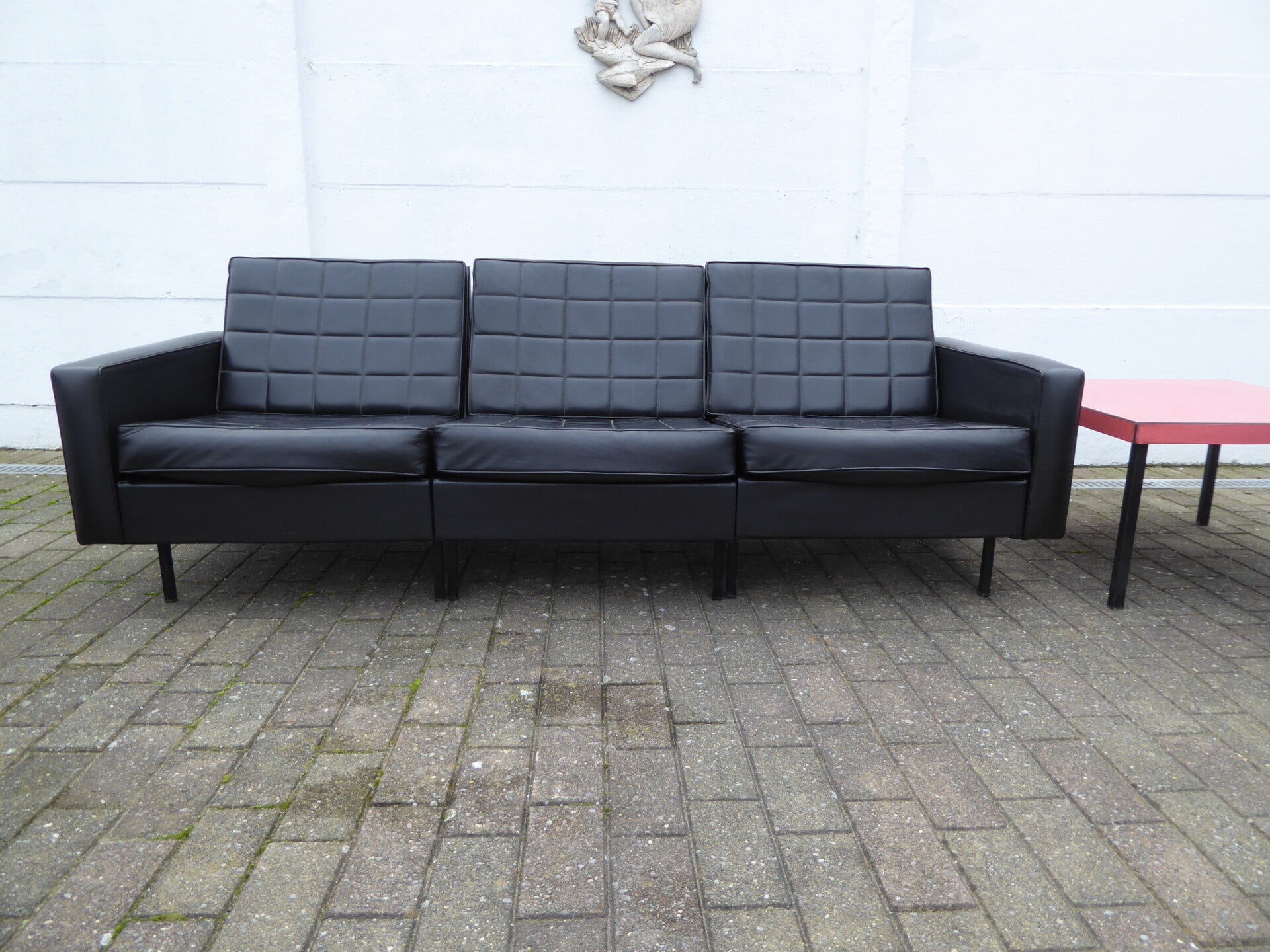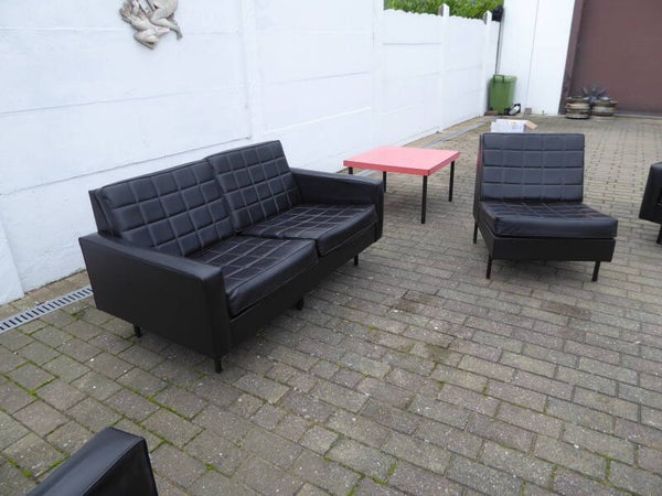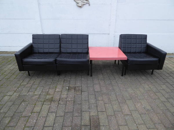 ZELDZAAM VOLLEDIGE SALON ENSEMBLE VAN MODULAIRE DRIEZITBANK, TWEE ARMZETELS EN DE ORIGINELE TAFEL.