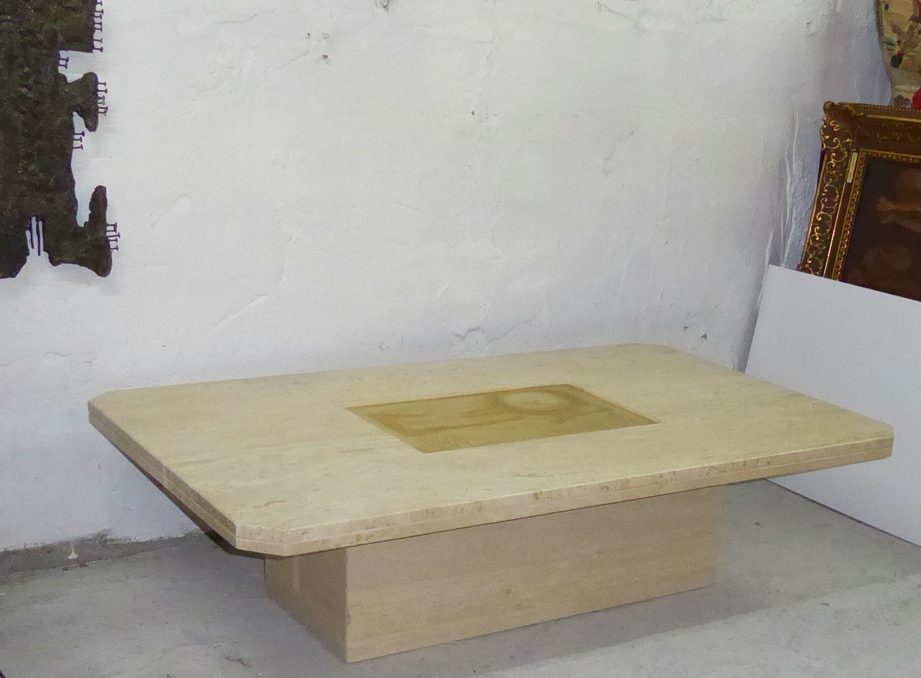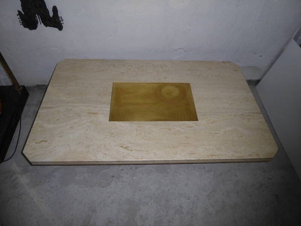 VERY NICE VINTAGE HEAVY TRAVERTINE MARBLE COFFEE TABLE DESIGNED BY GEORGES MATTHIAS. GILDED ETCHED BRASS PLAQUE IN THE MIDDLE THAT IS SIGNED DESIGNO MAHO AND NUMBERED.